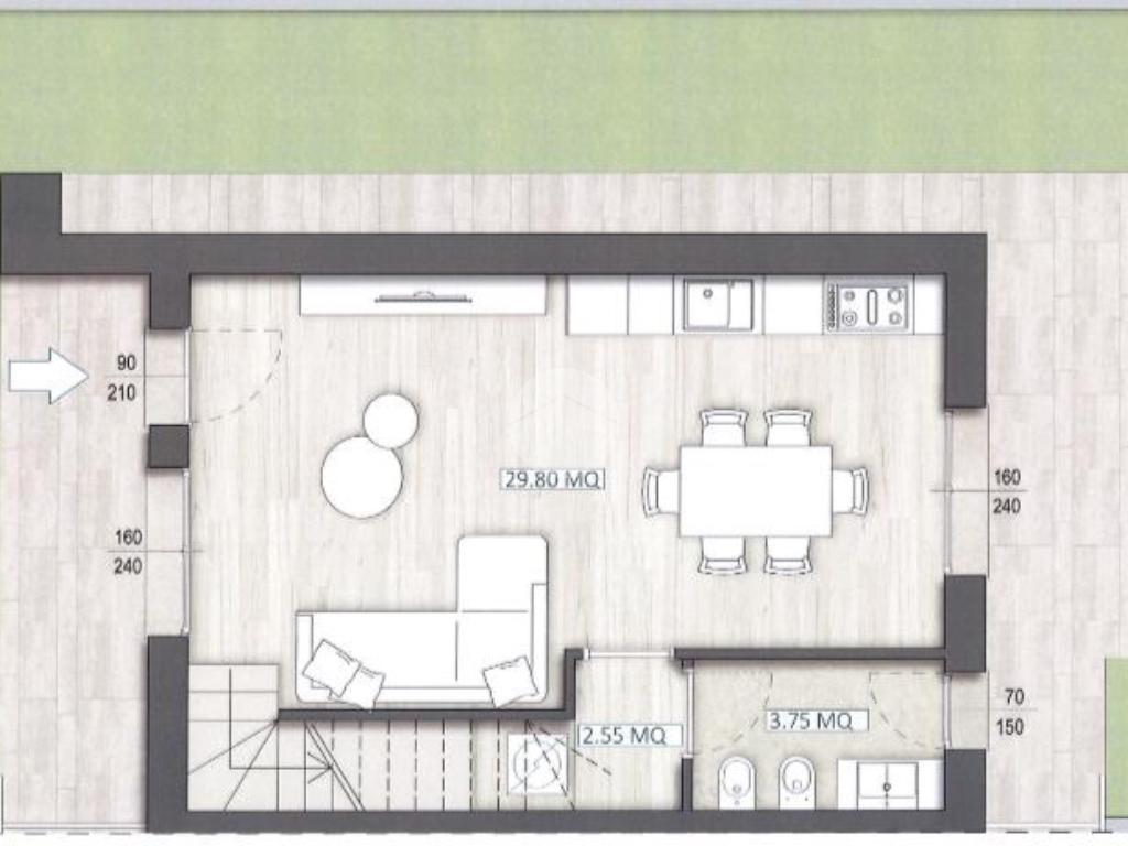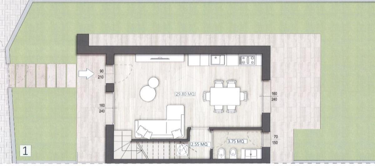 La villetta a schiera si sviluppa su due livelli e rappresenta la soluzione ideale per coppie e famiglie. Al piano terra troviamo un luminoso soggiorno con cucina a vista e un bagno; al piano primo due camere da letto e un secondo bagno. Ogni abitazione è dotata di giardino privato, balcone, posto auto coperto in area parcheggio privata e accesso alla piscina comune.
